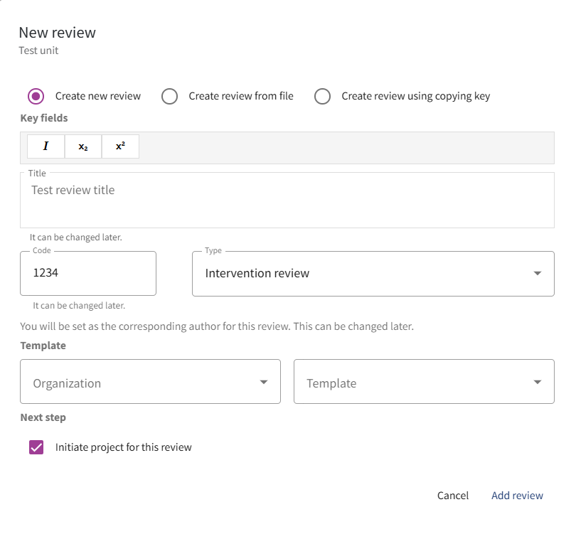 Leave the 'Initiate project for this review' option selected, unless you want to start working on this review at a later time. Deselecting this option will make the review read-only until a new project is started. Read how to start a project for a review.