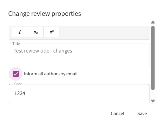 With the relevant role permissions, you can edit the review title and the review code. You can also notify all authors of the title change.